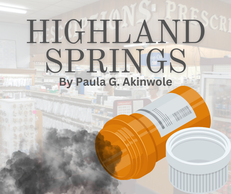 As per every Tuesday morning, Portia Prince walked into Franklin’s Family Pharmacy on Adams street. The store was a small family run business where the windows were covered in outdated medicine advertisements and an open/ closed sign that neighbors could mostly ignore. Inside the store was a giant plaster pill bottle. It had yellowed to almost brown over the years and was big enough passersby would take pictures with it or rub it for good luck. It was the stores only appeal. Much like everything else in Highland Springs, this store was forgotten and rarely got customers
